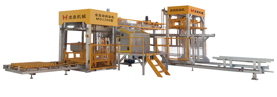 Offline Concrete Block Automatic Cuber for Palletization is The Tiger automatic brick separation and stacking line for concrete blocks can automatically separate the concrete blocks from the pallets and stack the concrete blocks into stacks with forklift access holes. This eliminates the need for pallet recycling, improves resource utilization, saves on labor costs, reduces the labor intensity of workers, and increases the automation level and production efficiency of brick manufacturing.